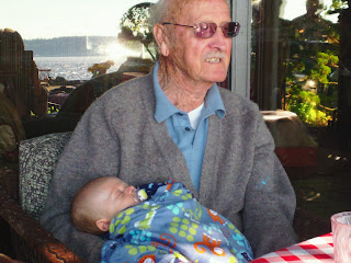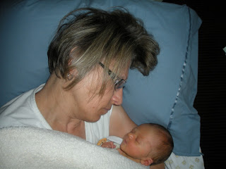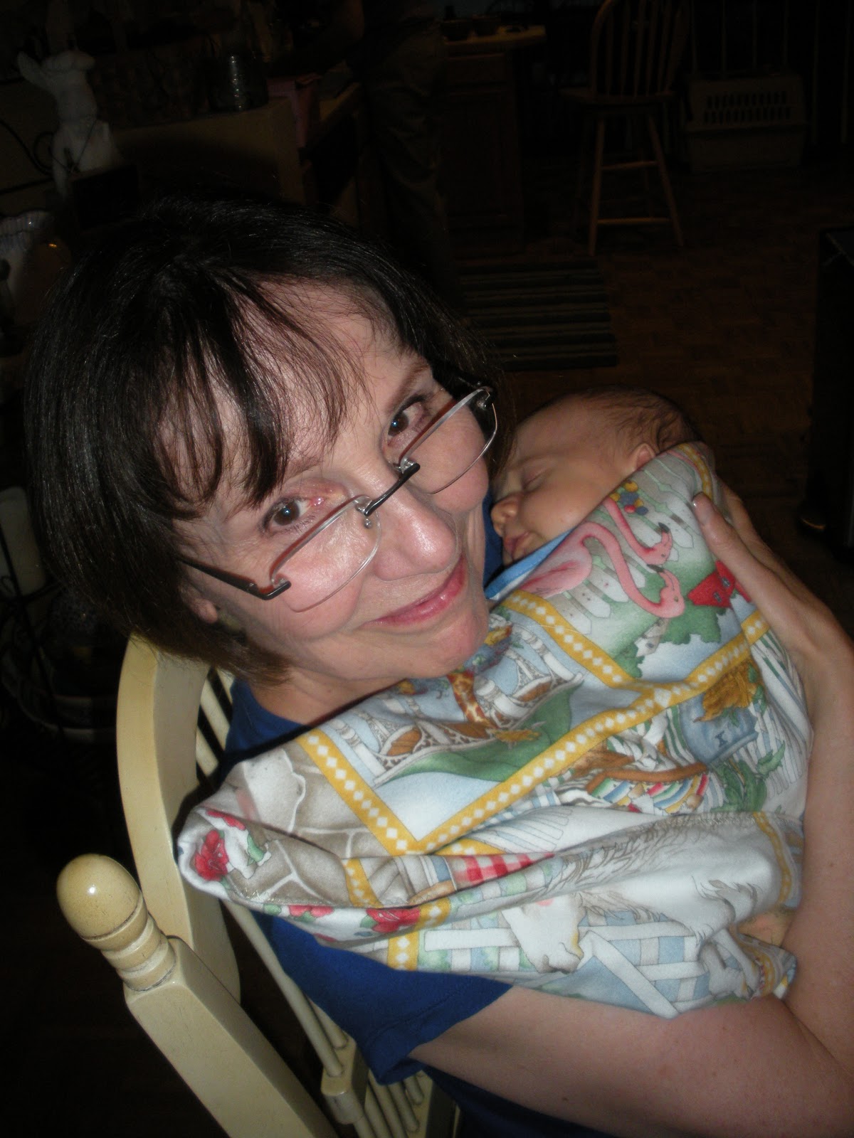 | (Snuggling with Grandma for a minute before mealtime. I love this picture.) |