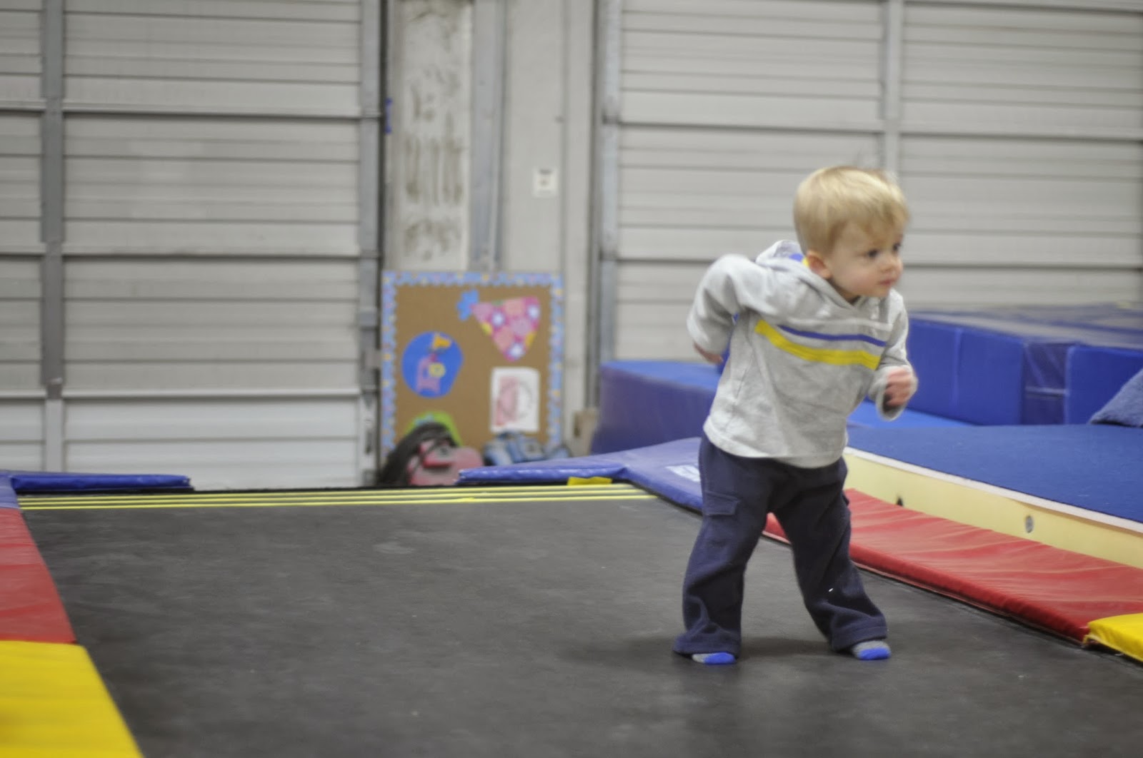 He ran the long trampoline and then would get excited and do a one-armed jig thing. Funny kiddo!