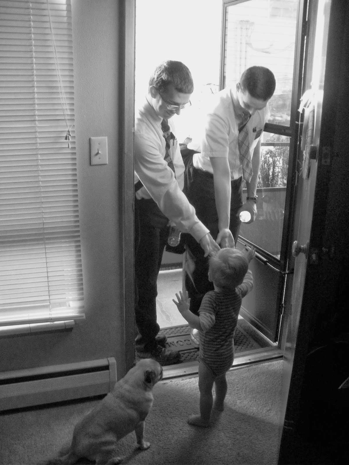 Elders Mackley and Huguley stopped by today to thank us for having them for dinner last Sunday. They are so sweet with Logan and he has really warmed up to them. On Sunday they watched Logan sign more as he stuffed himself plate after plate- 4 times. They told me today that is now an inside joke for them to sign that to each other at dinner. Love it. :) We have had them in our home several times and I will miss them when they move on. It's probably because I am now a mother to a son that I've developed such tender admiration for them and missionaries everywhere. I wrote their mothers after our dinner Sunday because I just had to share with them what a wonderful job their boys (who I'm sure they're missing like crazy) were doing.